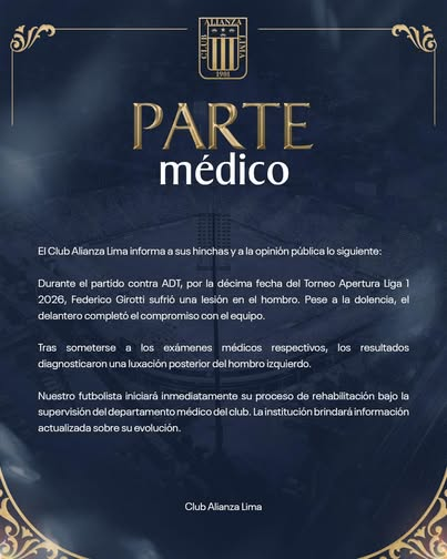 Alianza Lima informó que Federico Girotti sufrió una lesión en el hombro durante el encuentro ante ADT por la fecha 10 del Torneo Apertura de la Liga1 Te Apuesto 2026.